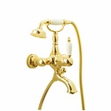 Назначение: ванна+душ • Конструкция: однорычажный • Монтаж: вертикальный • Материал: покрытие - золото • Подводка: жесткая • Монтажные отверстия: 2 отверстия • Форма излива: традиционная • Душевая лейка в комплекте: есть • Держатель для душевой лейки: на смесителе