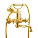 Назначение: ванна+душ • Конструкция: двухрычажный • Монтаж: вертикальный • Материал: покрытие - золото • Подводка: жесткая • Монтажные отверстия: 2 отверстия • Форма излива: традиционная • Душевая лейка в комплекте: есть • Держатель для душевой лейки: на смесителе