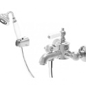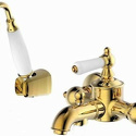 Назначение: ванна+душ • Конструкция: двухрычажный • Монтаж: вертикальный • Клапан: керамический • Материал: латунь, покрытие - бронза • Подводка: жесткая • Монтажные отверстия: 2 отверстия • Форма излива: традиционная • Душевая лейка в комплекте: есть • Держатель для душевой лейки: настенный держатель • Аэратор: есть • Эксцентрики в комплекте: есть