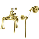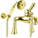 Назначение: ванна+душ • Конструкция: однорычажный • Монтаж: горизонтальный • Клапан: керамический • Материал: латунь, покрытие - золото • Монтажные отверстия: 2 отверстия • Форма излива: традиционная • Душевая лейка в комплекте: есть • Держатель для душевой лейки: настенный держатель • Аэратор: есть