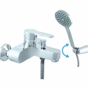 Назначение: ванна+душ • Конструкция: однорычажный • Монтаж: вертикальный • Клапан: керамический • Материал: латунь, покрытие - хром • Подводка: жесткая • Монтажные отверстия: 2 отверстия • Форма излива: традиционная • Душевая лейка в комплекте: есть • Держатель для душевой лейки: настенный держатель • Аэратор: есть • Эксцентрики в комплекте: есть • Донный клапан в комплекте: есть
